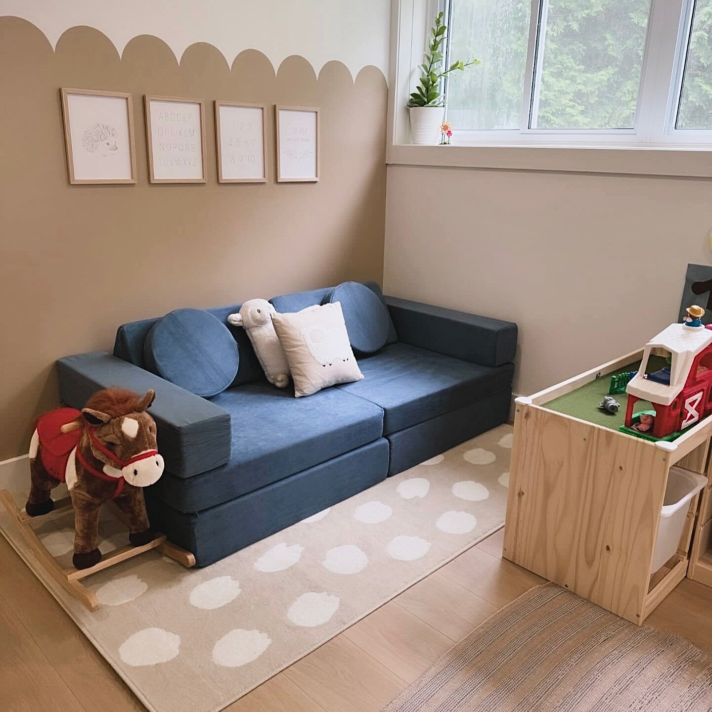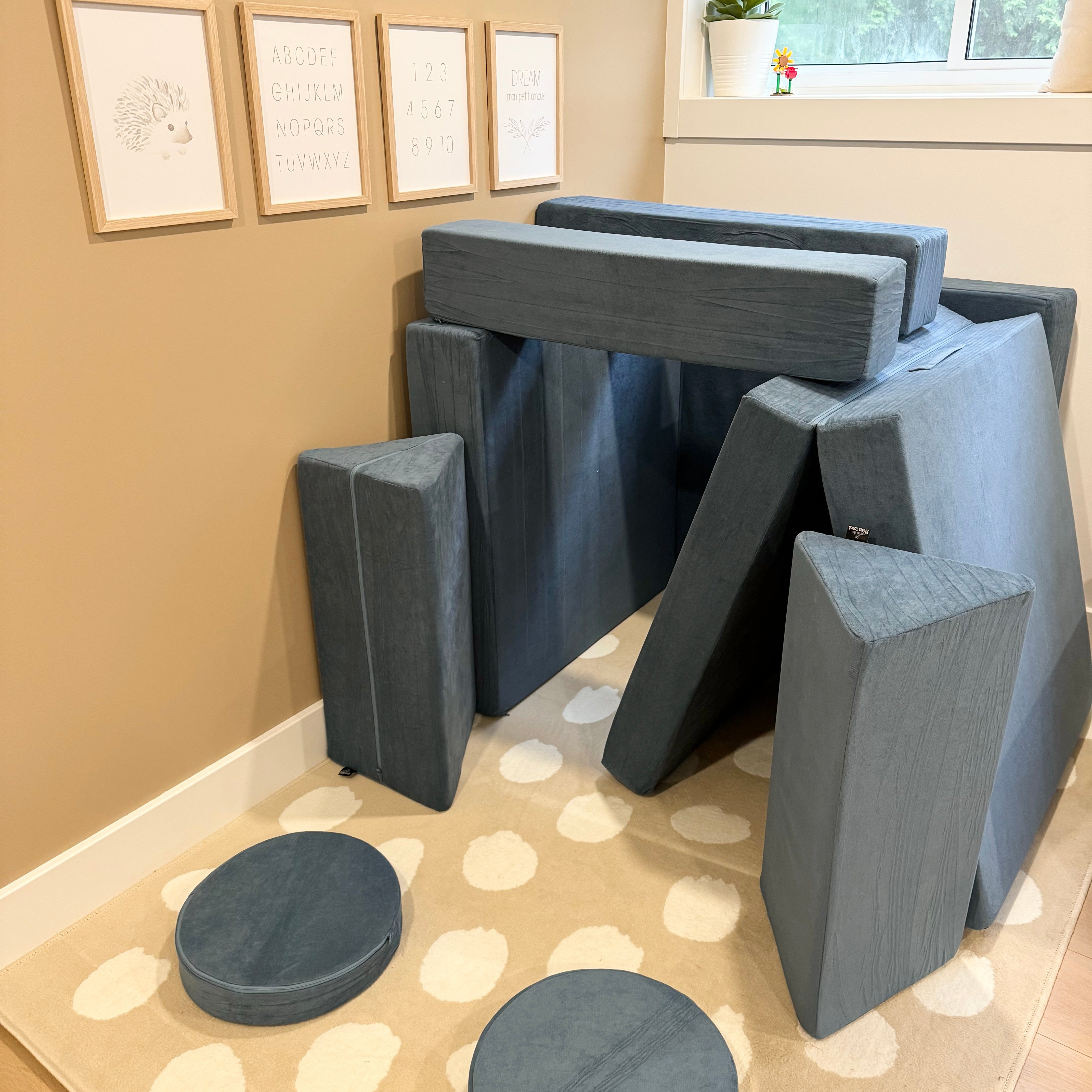 Two rectangular pieces of strong, sturdy, high density foam that serve as armrests, stepping logs for playing “Floor is Lava”, or pillars for building all sorts of fun creations.